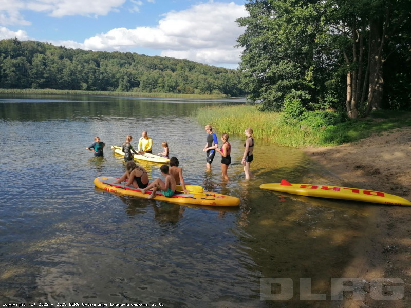 Letztes Wochenende fand die zweite Jugendveranstaltung dieses Jahres statt. Im Fokus stand die Arbeit mit den Rettungsgeräten, Gurtretter, Rettungsleine, Rettungsbord und Stand UP Paddel. Am Dolgener See haben dann Clemens und Florian der Jugend erklärt, wie man damit eine Person rettet. Danach wurde das Gelernte auch direkt geübt und getestet. Wieder am Stützpunkt angekommen war nach dem Abendessen noch viel Zeit für Spiel und Spaß. Der Tag wurde vorm Schlafen gehen schließlich mit einem Filmeabend beendet.