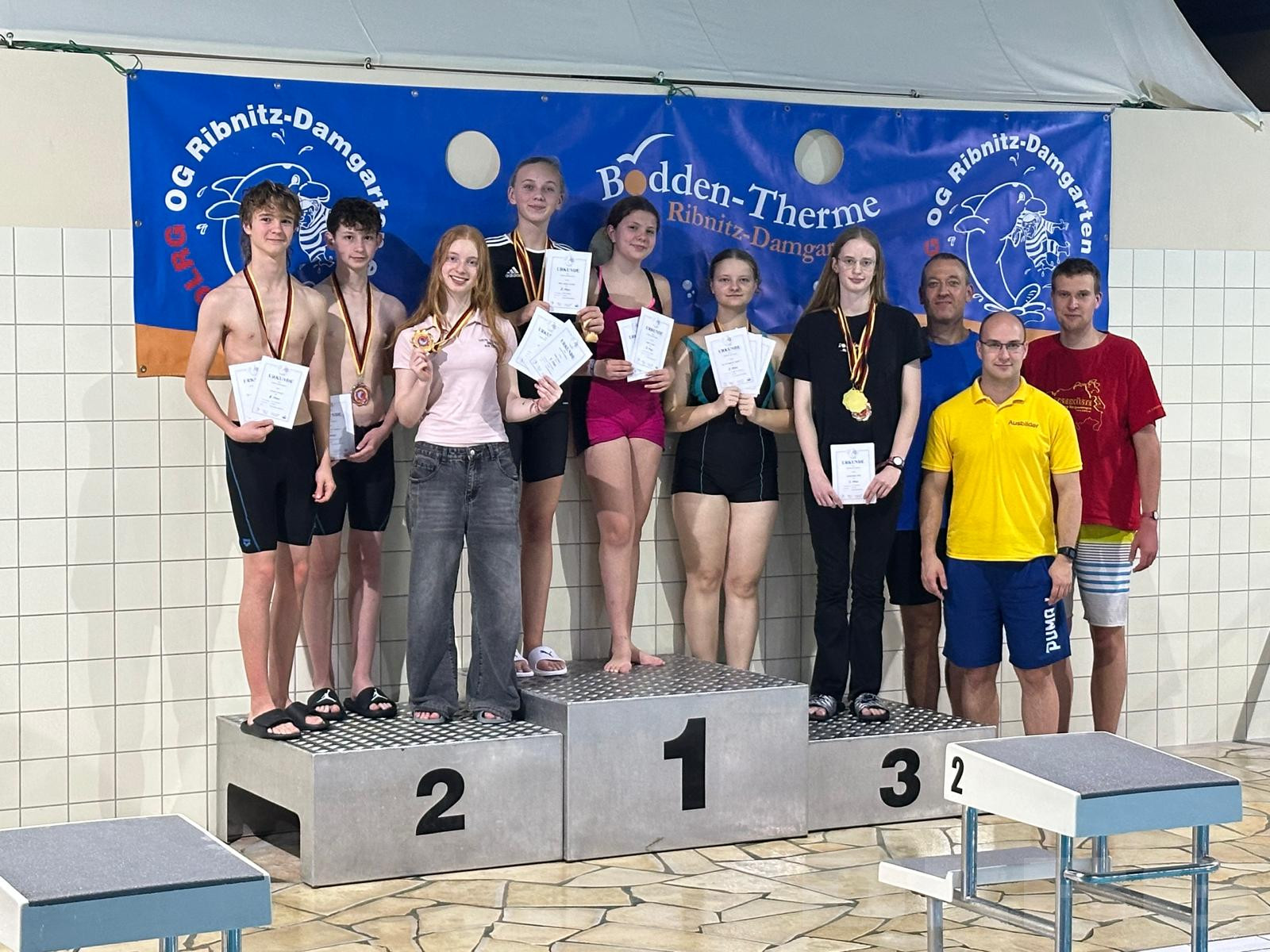 Am Vormittag starteten die Kinder in den Altersklassen 7/8 und 9/10 in den Disziplinen Brust-, Hindernis- und Freistilschwimmen. Beim Hindernisschwimmen muss ein 0,7 m tiefes Hindernis durchtaucht werden. Unsere jüngsten Starterinnen und Starter - Dorothea, Greta, Marla und Marvin - sammelten ihre ersten Wettkampferfahrungen gegen starke Gegnerinnen und Gegner aus Rostock, Ribnitz, Samtens und dem Fischland. Aufregende Wettkämpfe sorgten für tolle Platzierungen im Mittelfeld. In der Altersklasse 10 männlich gingen sechs Jungs für unsere OG an den Start. Sie lieferten sich mit 12 weiteren Gegnern spannende Wettkämpfe. Ben Meister erkämpfte sich über 50 m Brust den ersten Platz. Mattheo Louis Strauß schwamm in allen drei Disziplinen auf den dritten Platz.